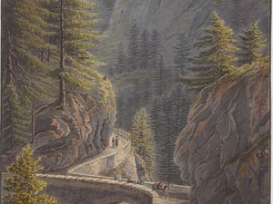 Between Domleschg and Schamsertal, the new highway - just like the Hinterrhein - squeezes through a narrow gorge. This is called the Viamala because it has always been a major obstacle to traffic. Johann Gottfried Ebel recalls in the accompanying text of this view: "The author of this book, who made a short trip to Thusis in the fall of 1819, dared to take his steps in this gorge over a kind of bridge made of tree trunks supported by high posts, which ran along the jagged sides of the rocks. From this fragile and dangerous bridge, he contemplated the horrors of the gorge. And although he was accustomed to the terrible scenes which often take place in the high Alps, he was not relieved of the terror which this awful precipice inspired in him until he could return to the valley. Any description of this wild nature would be incomplete and would fall short of reality."